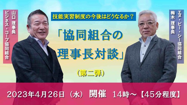 「共存共栄」を理念に掲げるエヌ・ビー・シー協同組合(所在地:東京都品川区、メックグループ代表:梅木俊孝)は、4月26日(水)14時に無料オンラインセミナー「第二弾 協同組合の理事長対談」を開催いたします。