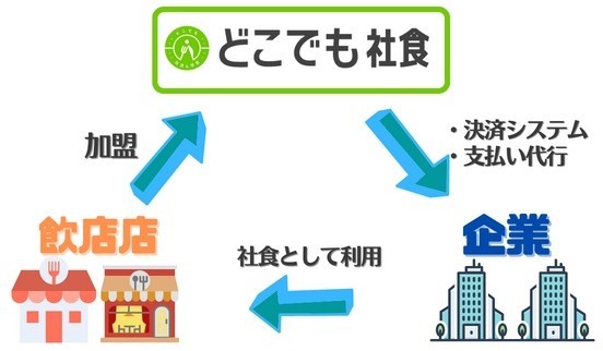 どこでも社食は、自社に社員食堂の設備を持たない企業でも、近くの飲食店と提携する事により「社食」環境を実現できるサービスです。