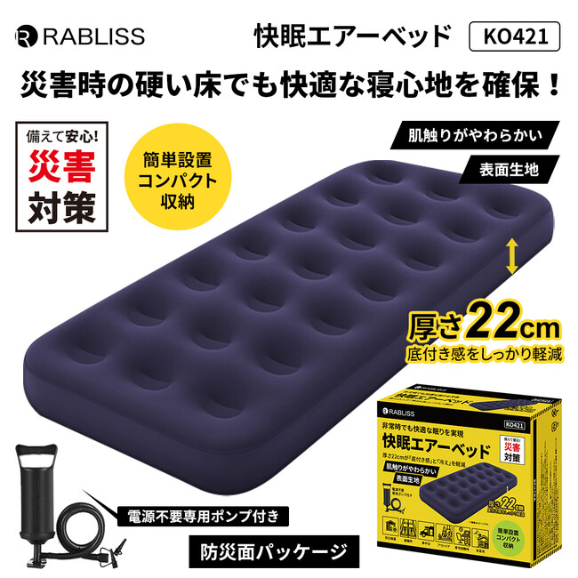 厚さ22cmのエアーベッドが、硬い床や冷えから身体を守ります。電源不要の専用ポンプで素早く膨らみ、すぐに使えます。軽量&コンパクト収納で備蓄や持ち運びに便利なエアーベッドです。