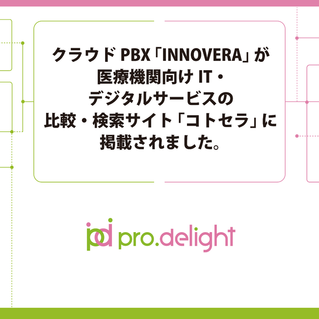 電話のDXを推進する株式会社プロディライト(大阪市中央区:代表取締役社長 小南 秀光、証券コード:5580、以下プロディライト)が提供するクラウドPBX「INNOVERA」が、エム・シー・ヘルスケア株式会社(東京都港区:代表取締役社長 三池 正泰、以下エム・シー・ヘルスケア)が運営する医療機関向けIT・デジタルサービスの比較・検索サイト「コトセラ」に掲載されました。