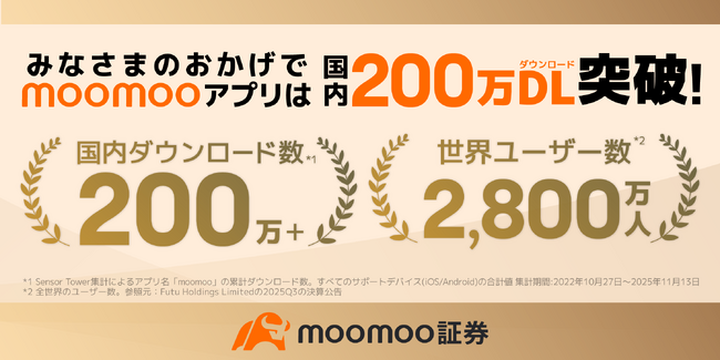 moomoo証券株式会社(本社:東京都渋谷区、代表取締役社長:伊澤フランシスコ)が提供する投資アプリが、2025年11月13日(木)、国内200万ダウンロードを達成(※1)しました。2022年10月27日のリリースから約3年での到達となり、国内ネット証券会社のアプリとしては異例のスピードで支持が拡大している事を示しています。