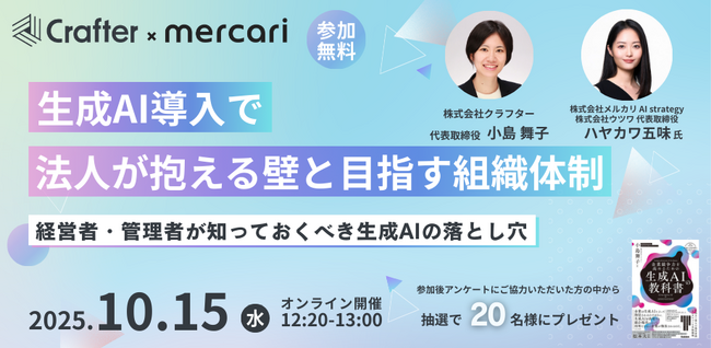 株式会社クラフター(本社:東京都港区、代表取締役 小島舞子)は、株式会社メルカリ ハヤカワ五味氏と共に、無料ウェビナー『生成AI導入で法人が抱える壁と目指す組織体制』を10月15日(水)に開催。