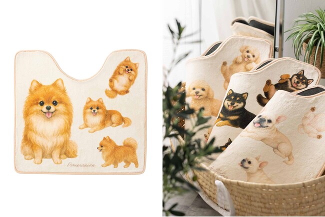 足元でちょこんと見守ってくれるような、愛くるしい犬のデザインがポイントのほっこりトイレマット。