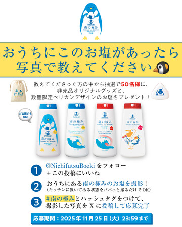 オーストラリアの天日塩「南の極み(みなみのきわみ)」は、2025年11月21日(金)~11月25日(火)の期間中、X(旧Twitter)にてフォロー&写真投稿キャンペーンを開催いたします。当選者の50名様には南の極みの期間限定ペリカンデザインボトルとオリジナルキャラクターが入ったおにぎりケース、巾着ポーチをセットにしてお届けする予定です。南の極みは日仏貿易株式会社(本社:東京都千代田区/代表取締役社長:ギヨーム・カルー)が取り扱うブランドです。