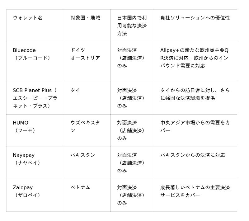 2025 年 11 月 28 日より、新たに 5 つの主要ウォレットが追加されます。これらのウォレットは、主に対面決済(店舗決済)に対応しており、POS レジや自動精算機を扱う事業者様にとって、顧客である店舗への強力な提案材料となります。