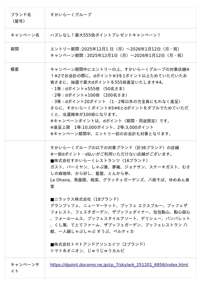 株式会社NTTドコモ(以下、ドコモ)は、すかいらーくグループにおいて、「ハズレなし!最大555倍ポイントプレゼントキャンペーン!」(以下、本キャンペーン)」を2025年12月1日(月)から2026年1月12日(月・祝)までの期間で開催いたします。