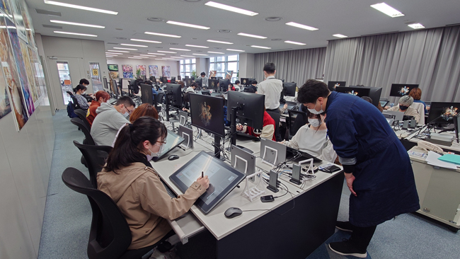 デジタル化が進むアニメやマンガ、ゲーム業界の制作環境を踏まえ、マンガ・アニメーション科ではデジタル環境で行える施設・設備を導入しています。学生の希望就職先でワコムの液晶ペンタブレットが多く導入されていることから、「Wacom Cintiq」をご採用いただきました。最新のマンガ・アニメ業界に準拠した液晶ペンタブレットを使った、企業と連携したカリキュラムを実施することで、実践に即した体験と学びの場が提供されています。