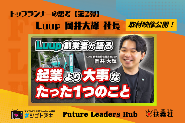 「企業の情報と印象をデザインする」をコンセプトに掲げ、メディアとWEBとオフラインを融合させたマーケティング戦略を提供する、株式会社アナログPR(本社:東京都港区、代表取締役:松浦啓介)は、弊社が企画運営に携わる、株式会社扶桑社(本社:東京都港区、代表取締役社長:秋尾弘史)のZ世代向け新経済メディア「Future Leaders Hub」が、フジテレビ公式YouTubeチャンネル「#シゴトズキ」制作のもと、「トップランナーの思考」第2弾として、株式会社Luup代表取締役CEO岡井 大輝氏への取材映像を公開したことをお知らせいたします。本企画は、経営者の戦略的思考や経営哲学を映像でZ世代に届け、次世代リーダーの学びにつなげることを目的としています。