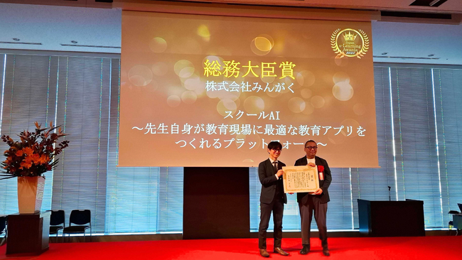株式会社みんがく(本社:東京都新宿区、代表取締役:佐藤雄太)は、このたび「第22回日本e‑Learning大賞」において総務大臣賞を受賞し、2025年11月17日に開催された授賞式に出席いたしました。