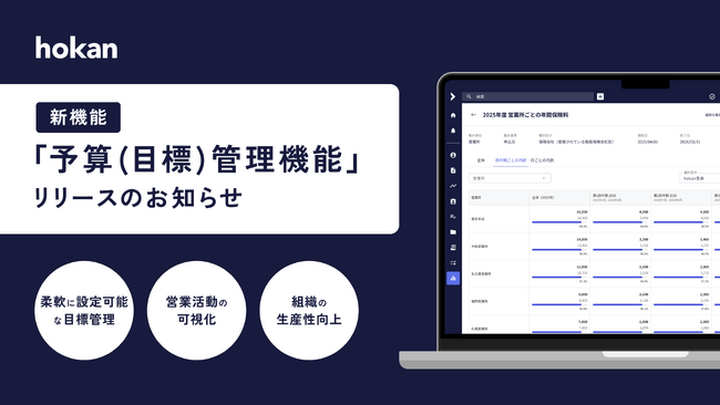 「適正な営業活動」と「組織の強固な監査体制」を実現するクラウド型保険代理店システム「hokan(R)︎」を提供する株式会社hokan(ホカン、本社:東京都中央区、代表取締役:横塚 出、以下:当社)は、2025年12月より、「hokan(R)︎」新機能として「予算(目標)管理機能」をリリースすることをお知らせいたします。