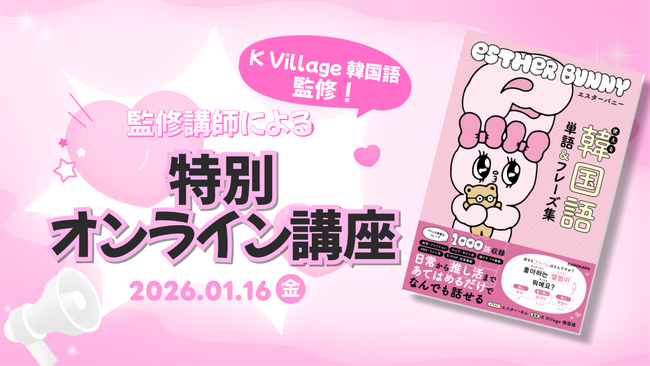 日本最大級の韓国語教室「K Village 韓国語」を運営する株式会社K Village(本社:東京都新宿区、代表取締役社長:桑原 元就)は、韓国好きのためのコミュニティアプリ「K Village MODULY」ユーザー向けに、監修を担当した韓国語学習書『エスターバニー 使える韓国語 単語&フレーズ集』(KADOKAWA)の発売を記念し、2026年1月16日(金)に特別オンラインイベントを開催いたします。