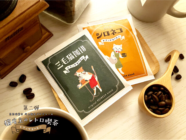 レトロな喫茶店の店主をイメージした猫のデザイン(「シロネコ」と「三毛猫」)と、お好みで選べる2種類のコーヒーが、喫茶店で過ごすような素敵なひとときをお届けします。手軽な1杯分の個包装で、ちょっとしたギフトにもおすすめです。