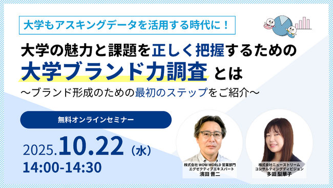 SaaSの開発・提供を通して企業や団体のCX向上を支援する株式会社WOW WORLD(ワオワールド/本社:東京都品川区、代表取締役社長:美濃 和男、以下、当社)は、大学関係者向けの無料オンラインセミナー「大学もアスキングデータを活用する時代に!大学の魅力と課題を正しく把握するための『大学ブランド力調査』とは」を、2025年10月22日(水)に開催いたします。本セミナーでは、アスキングデータをはじめとするマーケティング手法を活用し、大学ブランド力を戦略的に管理・強化する方法について、基本から順序だてて解説いたします。