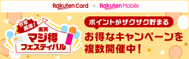 楽天カード株式会社(以下「楽天カード」)は、楽天モバイル株式会社(以下「楽天モバイル」)とともに、本日2025年11月21日(金)から2025年最後の「楽天マジ得フェスティバル」を共同で開催いたします。「楽天カード新規入会&1回利用で10,000ポイント」キャンペーン(注1)、「【楽天カード会員様対象】楽天モバイル初めてお申し込みで20,000ポイント」キャンペーン(注2)(注3)など、全部で6つのキャンペーンが「楽天マジ得フェスティバル」で開催されます。