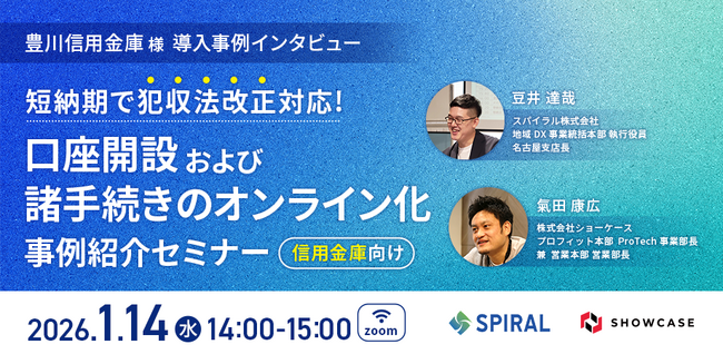 デジタルで未来最適をリードするスパイラル株式会社(東京都港区、代表取締役グループCEO 佐谷 宣昭)は、株式会社ショーケース(東京都港区、代表取締役社長 平野井 順一(以下「ショーケース」)と、信用金庫向けオンラインセミナー「口座開設および諸手続きのオンライン化事例紹介セミナー」を2026年1月14日(水)に開催いたします。本セミナーでは、当社が提供するローコード開発プラットフォーム「SPIRAL」とショーケースが提供するオンライン本人確認(eKYC)サービス「ProTech ID Checker」を連携し、短期間で口座開設に関する諸手続きをオンライン化した豊川信用金庫(愛知県豊川市、理事長 真田 光彦)の導入事例インタビューをご紹介します。