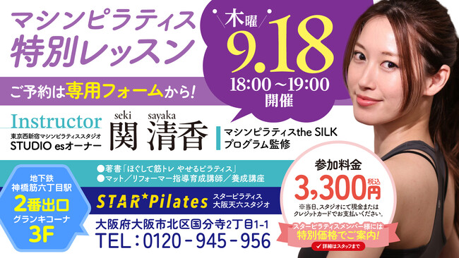 全国9スタジオを展開するスターピラティスが、大阪・天六で初の外部講師イベントを開催。人気インストラクター関 清香氏による【10名限定】特別レッスンを体験できる貴重な機会です。