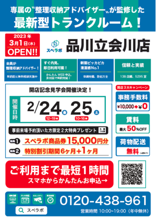 Mapion > ニュース > リリース > 【品川立会川店/3月1日(水)オープン】見学から契約、解約まで完全非接触・非対面、お申し込みからご利用まで最短1時間!都内、大阪などにて絶賛運営中のトランクルーム【スペラボ】が立会川駅近くに出店!