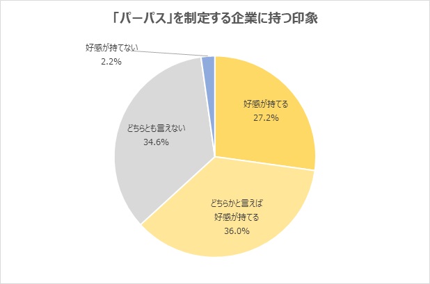 20代におけるパーパスを制定する企業に持つ印象では、63%以上が好感を持つという結果が出ています。企業は学生を、選ぶ時代から選ばれる時代へ変化したと言われる昨今で、若者の過半数以上が指示しているということは、当然今後の経営のキーになってくると言えます。