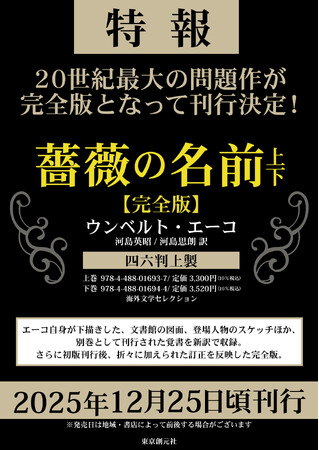 20世紀最大の問題作として全世界で異例の大ベストセラーとなったウンベルト・エーコの話題作『薔薇の名前』。その[完全版]を東京創元社より2025年12月25日頃に刊行することが決定いたしました!