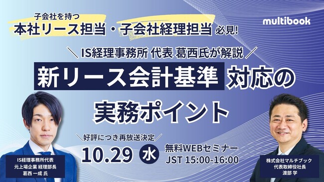 グローバルクラウドERPサービス「multibook(マルチブック)」を提供する株式会社マルチブック(東京都品川区、代表取締役社長:渡部 学)は、IS経理事務所(代表 葛西 一成 氏)と共同で2025年3月に開催したWebセミナー、「親会社の決算担当者・子会社の経理担当者必見!新リース会計基準対応の実務ポイント」を、好評につき再放送いたします。