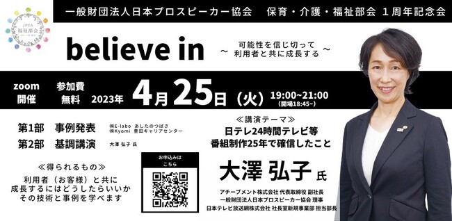 Mapion > ニュース > リリース > 【4/25(火)開催 JPSA保育・介護・福祉部会】日本テレビで25年に渡り番組制作をしてきた大澤弘子氏が語る『人の可能性』 「良好な人間関係」と「よりよく生きる」の両立に向けて