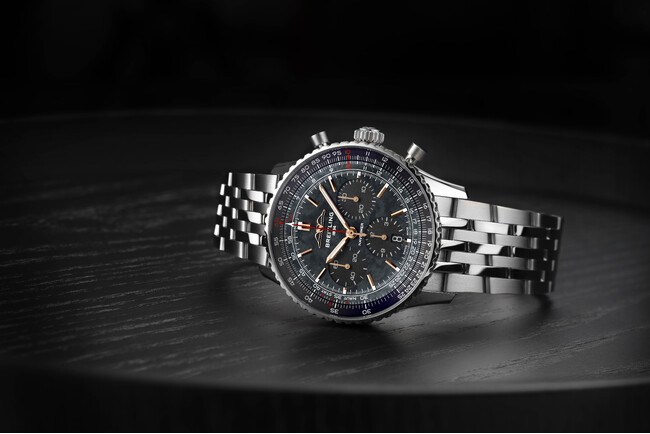 ブライトリングのアイコニックなクロノグラフ、ナビタイマー。ブランドの象徴たるコレクションから、ブラックのマザーオブパールダイヤルにブラックのサブダイヤルを組み合わせたオールブラック仕様が登場。天然素材ならではの神秘的な煌めきは、ゴールドカラーの針とインデックスと美しく調和し、唯一無二の存在感を放ちます。
