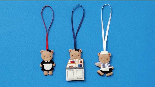 マモン・エ・フィーユで店番・店員・パティシエのお仕事をするクマちゃんたちのチャームが3種類 登場。実際の制服や店内の様子を抜きだしたデザインで、一つひとつ手作りで仕上げています。