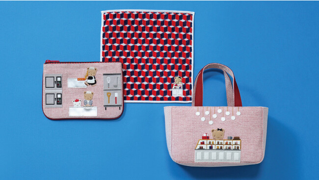 フィナンシェの生地を絞ったり、ビスキュイの生地を1枚1枚手作業で型抜きしたり、一つひとつ丁 寧にお菓子作りをされているマモン・エ・フィーユのパティシエさんたちをクマちゃんで表現しまし た。オーブンや職人さんたちのお仕事道具、実際のキッチンの様子をファミリアの世界観でデザイ ンしました。本体カラーに合わせたファミリアチェックのオリジナルファスナーもポイントです。