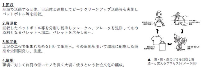 『UpDRIFT(R)』は海岸等で回収したペットボトル等を繊維の原料として資源化し、環境負荷の低い新しい製品として蘇らせるプロジェクトです。原料となるペットボトルは、地域活動団体や地方自治体、企業等と連携して行うクリーンアップ活動「Green and Blue Challeng(R)(グリーン アンド ブルー チャレンジ)」を通して回収し、分別や洗浄を行ってから資源化・製品化しています。ペットボトルを新しいアイテムへ生まれ変わらせる他にも、旅行会社や学校と連携した「SDGsを学ぶ修学旅行プログラム」を実施し、プログラムを通して環境問題について考える・取り組むきっかけを提供する活動を行っています。