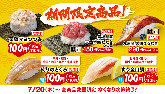 Mapion > ニュース > リリース > 【はま寿司】宮城県産天然本鮪、九州産うなぎ、栗蟹が登場!「炙り金目鯛」「炙りのどぐろ」も地域限定で販売 期間限定のこだわりの商品をお見逃しなく!