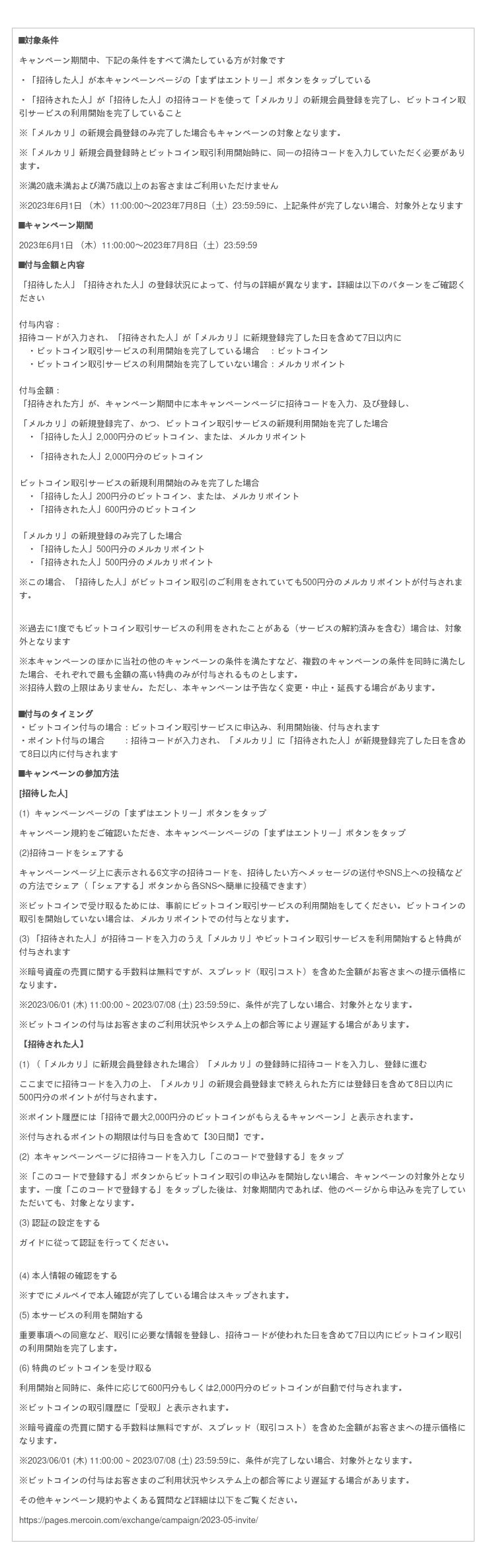 ※1:招待された方が「メルカリ」の新規登録とビットコイン取引サービスの新規利用申込の両方を完了した場合、2,000円分のビットコイン又はポイントが付与されます。「メルカリ」の新規登録のみ、ビットコイン取引サービスの新規利用申込のみの場合、それぞれ付与金額は異なります。(条件等の詳細はキャンペーンページをご覧ください https://pages.mercoin.com/exchange/campaign/2023-05-invite/)キャンペーンによるビットコイン付与の際、スプレッド(取引コスト)を含めた金額がお客さまへの提示価格になります。