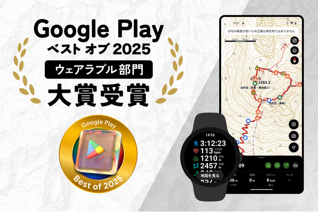 登山アプリ「YAMAP」を運営する株式会社ヤマップ(福岡市、代表取締役CEO 春山慶彦、以下ヤマップ)は、この度、Google が選出する「Google Play ベスト オブ 2025」において、ウェアラブル部門の大賞を受賞いたしました。
