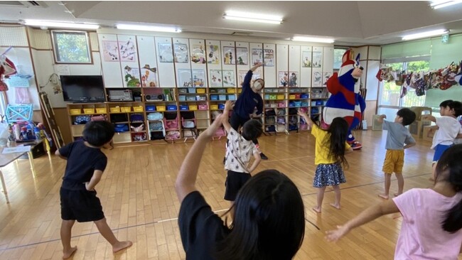 交流会ではキングスやキングスダンサーズ、ゴーディーにまつわるクイズゲームとストレッチやダンスを通して体を動かす事の楽しさを体験しながら、園児たちとの交流を深めました。