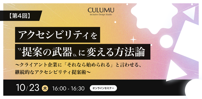 10月23日(木)16時から「【第4回】アクセシビリティを“提案の武器”に変える方法論 ~クライアント企業に「それなら始められる」と言わせる、継続的なアクセシビリティ提案術~」 セミナーを開催します。