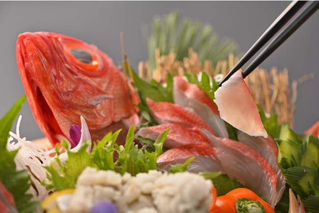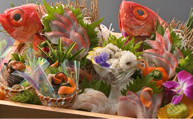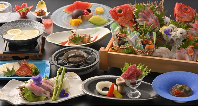 夏に旬を迎える『高知県室戸の金目鯛』をメインに、香川のごちそうを詰め込んだ期間限定特別な会席コースをご用意しました。夏の涼味を感じる西瓜のスパークリングから始まり、メインのお造りは金目鯛の姿造りと瀬戸内のお刺身を加えた豪華5種盛りでご用意。また、金目鯛とさぬきのアスパラ『さぬきのめざめ』をさっぱりレモンと蛤の旨味で味わう出汁鍋のしゃぶしゃぶや、『鮑』の踊り焼き、夏野菜と共にご賞味頂く『オリーブ牛』はステーキで。さらには〆の食事は小豆島素麺『島の光』と金目鯛を合わせた豪華な鯛麺を夏らしくぶっかけ風にアレンジした、瀬戸内とさぬきの夏のごちそうです。