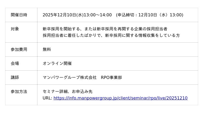 総合人材サービスのマンパワーグループ株式会社(本社・東京都港区、代表取締役社長:池田 匡弥、以下マンパワーグループ)は、12月10日(水)13:00~14:00に、これから新卒採用に取り組むことを検討している企業の採用担当者を対象とした無料オンラインセミナー「はじめての新卒採用 基本と進め方」を開催します。本セミナーでは、新卒採用と中途採用の違いを踏まえ、スケジュール設計・採用計画の策定から、各フェーズにおける具体的な取り組み内容まで、体系的に解説します。