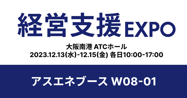 アスエネ株式会社(本社:東京都港区、代表取締役CEO:西和田 浩平、以下「当社」)は、12月13日(水)~12月15日(金)に大阪南港 ATCホールで開催される「経営支援EXPO2023 冬 大阪」に出展します。当社ブースでは、CO2見える化・削減・報告クラウドサービス「アスエネ」、持続的なサプライチェーン調達のESG評価サービス「アスエネESG」の紹介をします。