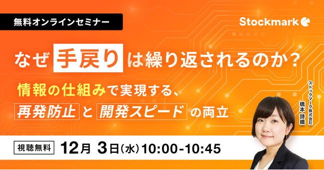 Mapion > ニュース > リリース > 【12月3日(水) 無料セミナー】『技術者の時間を奪う“手戻り”を断つ 情報の仕組みで実現する、再発防止と開発スピードの両立』(ストックマーク主催)
