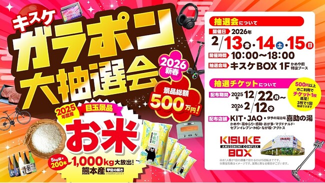 キスケ株式会社(本社:愛媛県松山市)が運営する総合エンターテインメント施設「キスケBOX」では、2026年2月13日(金)・14日(土)・15日(日)の3日間、新春恒例イベント「キスケ ガラポン大抽選会」を開催いたします。