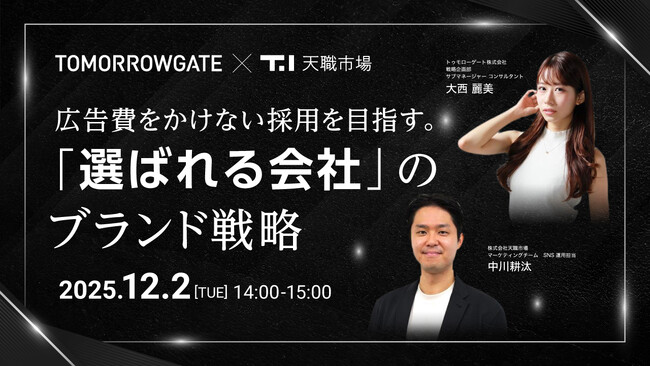 「働く」に関する社会課題をビジネスで解決するキャムコムグループの株式会社天職市場(以下天職市場、本社:東京都新宿区、代表取締役:春名敬太)と、トゥモローゲート株式会社(本社:大阪市中央区、代表取締役:西崎康平)は、2025年12月2日(火) 14:00よりオンラインセミナー「広告費をかけない採用を目指す。「選ばれる会社」のブランド戦略」を共同開催いたします。