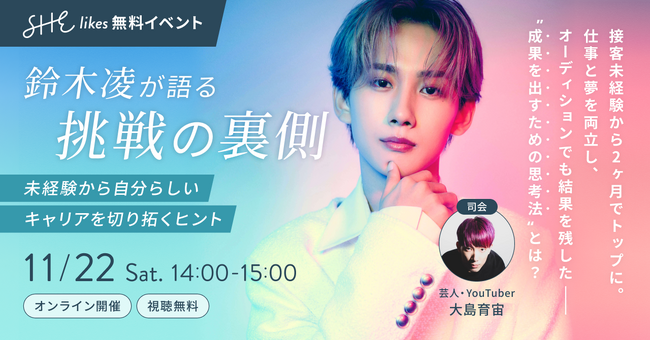女性向けキャリアスクール「SHElikes(シーライクス)」を運営するSHE株式会社(所在地:東京都港区、代表取締役:福田恵里、以下SHE)は、SHElikesのアンバサダーを務めるアーティスト 鈴木凌さんを迎えた無料オンラインイベント「鈴木凌が語る挑戦の裏側~未経験から自分らしいキャリアを切り拓くヒント~」を、2025年11月22日(土)14時に開催を決定し、視聴申し込みを開始いたしました。