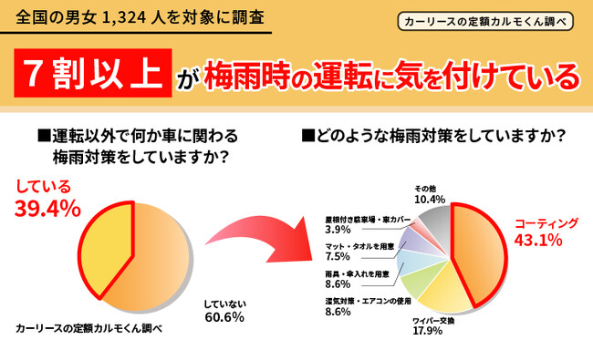 個人向けカーリースサービス「おトクにマイカー 定額カルモくん」(以下、定額カルモくん)を提供するナイル株式会社(本社:東京都品川区、代表取締役社長:高橋 飛翔)は、自家用車を所有する全国の男女1,324人を対象に、梅雨時期の運転で気を付けていることや洗車頻度、車の梅雨対策などについてインターネット調査を実施しましたので、調査結果をお知らせいたします。
