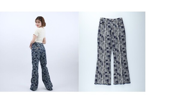 ベルボトムシルエットは足が長く見えトレンド感があるシルエット。丈が長めなので切りっぱなしなので身長に合わせて裾のカットが可能。バックポケットには王林さん手書きの岩木山刺繍モチーフが入ります。ウエストには実際に青森で1つ1つ手作業で作成した、オリジナルのこぎん刺繍タグがついています。
