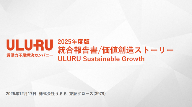 労働力不足問題解決のリーディングカンパニーとして、複数の SaaS を展開する株式会社うるる(東京都中央区 代表取締役社長CEO 星 知也、以下「うるる」)は、2025年12月17日(水)に、2025年度版 統合報告書/価値創造ストーリー『ULURU Sustainable Growth』(以下、「本報告書」)を公開したことをお知らせいたします。