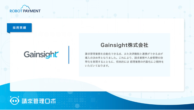 株式会社ROBOT PAYMENT(本社:東京都渋谷区、代表取締役:清久 健也、証券コード:4374、以下 当社)は、請求・債権管理システム「請求管理ロボ」が、世界シェアトップのCustomer-Led Growthプラットフォームを提供するGainsight株式会社(日本法人:東京都港区、代表取締役社長 絹村 悠、以下 Gainsight社)に採用されたことをお知らせします。