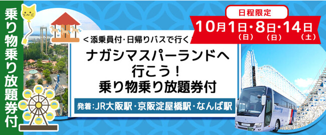 10月1日(日)・8日(日)・14日(土) 限定〈大阪・淀屋橋・難波発着〉 ナガシマスパーランド 1日乗り物乗り放題券付き 日帰りバスプラン 詳細はこちら https://4trip.jp/dome/plan/13780