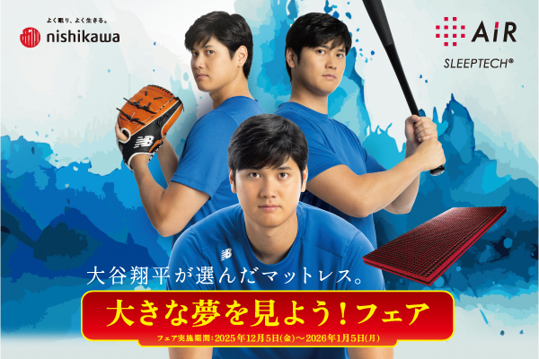 西川株式会社(本社:東京都中央区日本橋富沢町 社長:菅野達志、以下nishikawa)が展開するSLEEP TECH(R)ブランド[エアー]は、大谷翔平選手をイメージキャラクターに起用した『大きな夢を見よう!フェア』を2025年12月5日(金)~2026年1月5日(月)の期間で開催します。実施店舗は全国の[エアー]取扱い店舗です。