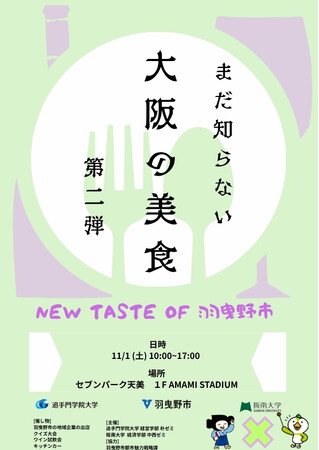 11月1日(土)には、阪南大学および羽曳野市と連携し、松原市の商業施設「セブンパーク天美」で「まだ知らない大阪の美食 第二弾 ―NEW TASTE OF 羽曳野市&吉野町―」と題したプロモーションイベントを開催。ワインの試飲会や活動報告会に加え、羽曳野市の山入端 創市長と本学の真銅 正宏学長によるトークセッションも実施します。