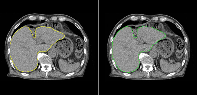 肝臓モデルを使用した例では、輪郭作成に要する時間は、従来の手作業のみでは30分以上要したものが、臨床利用ための人による修正時間も含め、Ai-Segによる自動輪郭作成及び必要に応じての軽微な修正作業を合わせて5分程度までに短縮することができました。図1に示すように医師とAi-Segが作成した輪郭を比較しても違いがわからないほどの水準にまで達しています。