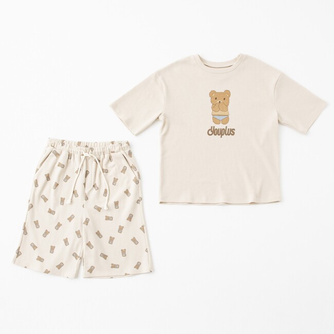 同プリントを大きくボディにあしらったTシャツとハーフパンツはセットアップとしても単品使いでも着用可能なので、デイリーな着こなしも楽しめます。